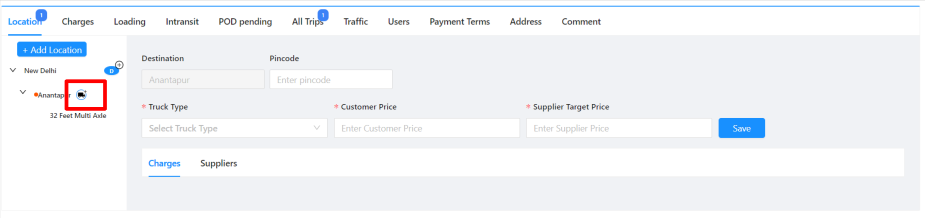 +After updating the destination lane details, users can add multiple truck types for the created lane by clicking the "Add Truck" button displayed near the destination name. Clicking the "Add Truck" button will open the "Add Truck Type" module, where users can input the truck type, Customer Price, and Supplier Target Price, similar to what they added before. Once the data is entered, users can save the information for the new truck type. Users can follow the same process for adding multiple truck types, allowing them to efficiently specify different pricing and target details for various truck types associated with the created lane.