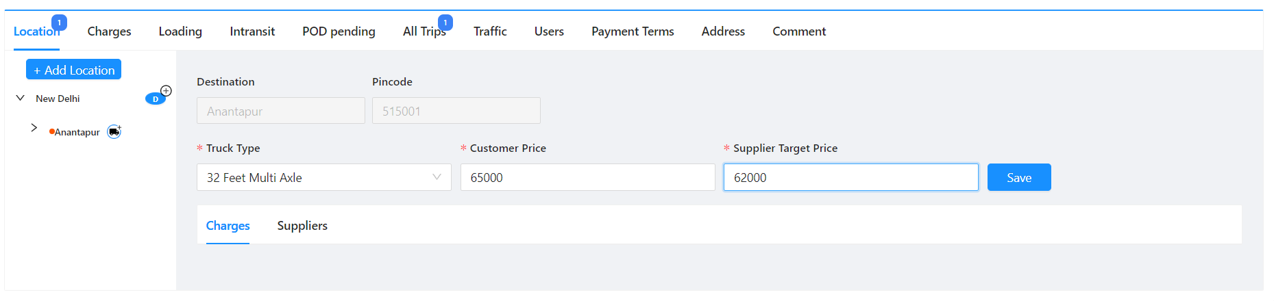+After updating all the mandatory data, the user can proceed to create a destination lane by clicking the "Save" button. Upon clicking the "Save" button, the user will be redirected to a screen where they can input information related to the truck type, Customer Price, and Supplier Target Price for the specific lane.